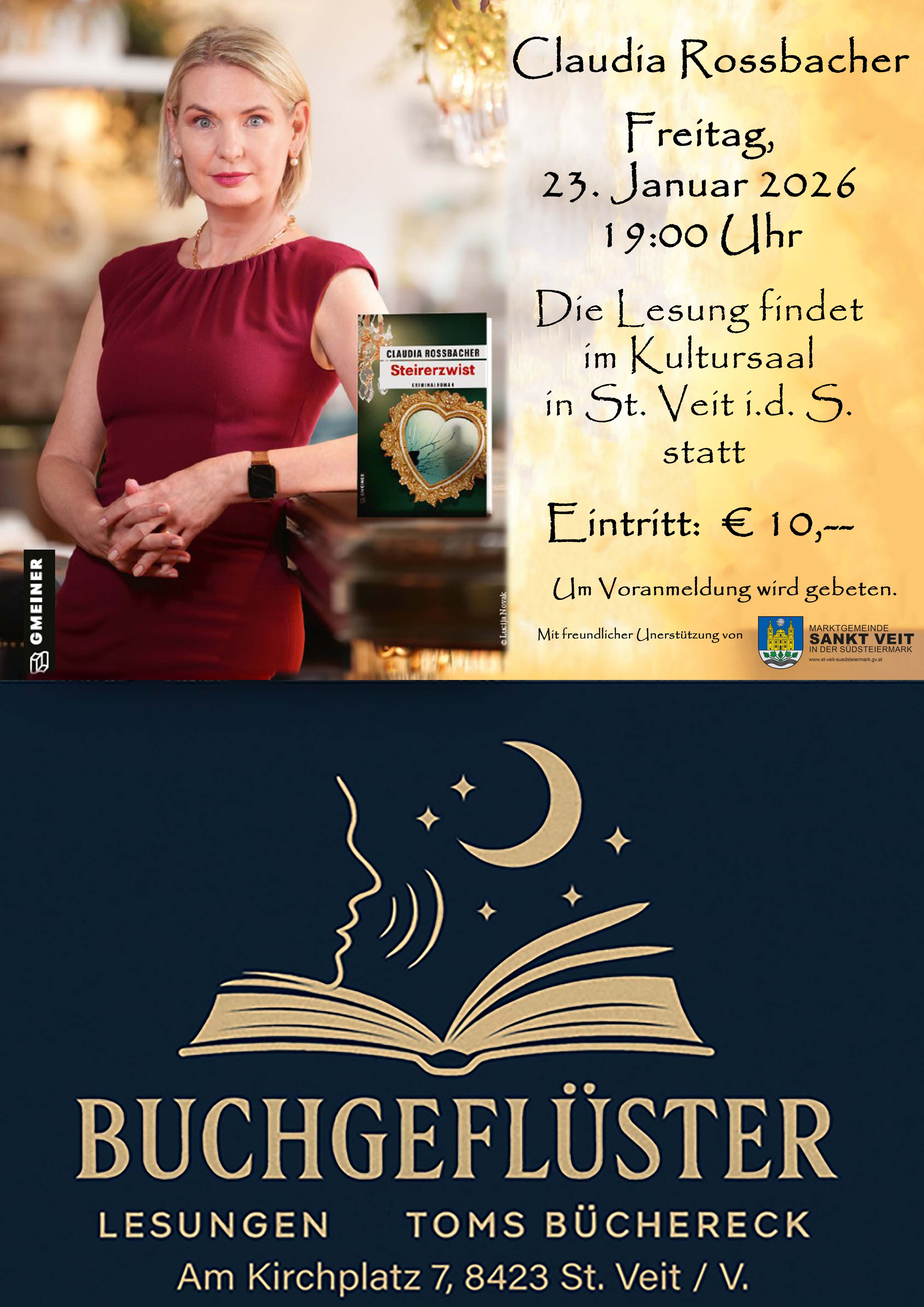 Claudia Rossbacher wird ihr neues Buch “Steirerzwist” vorstellen und dann auch ihr Buch signieren und für Fragen zur Verfügung stehen.